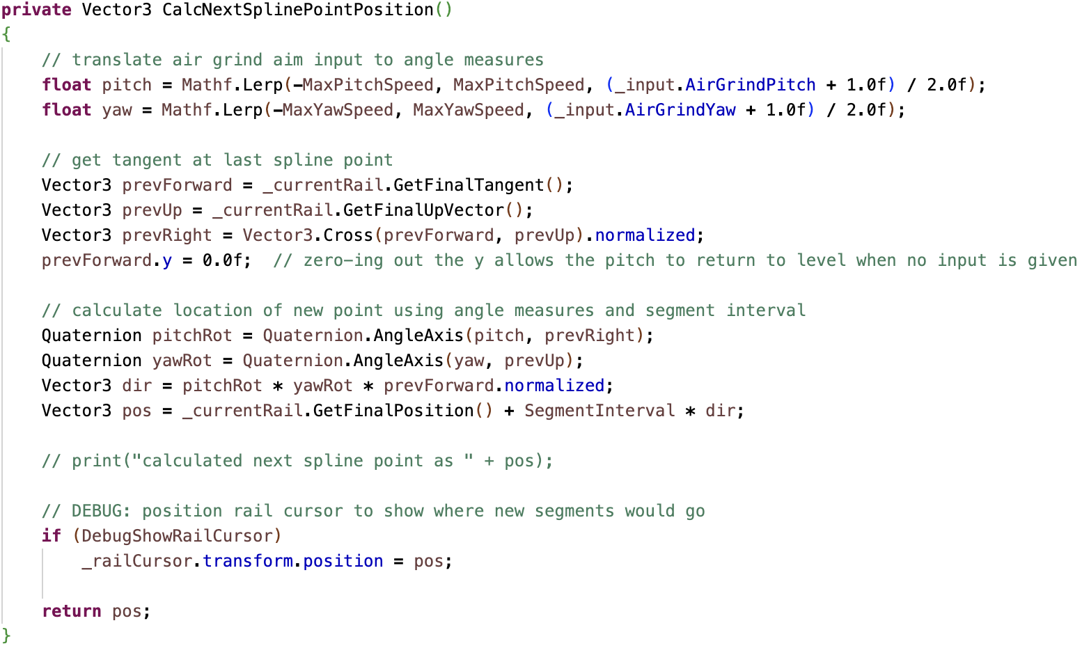 The single hardest move to implement was by far the Air Grind. My quick and dirty first pass involved instantiating a bunch of small rail segment prefabs, but this looked blocky and wasn’t performant.
