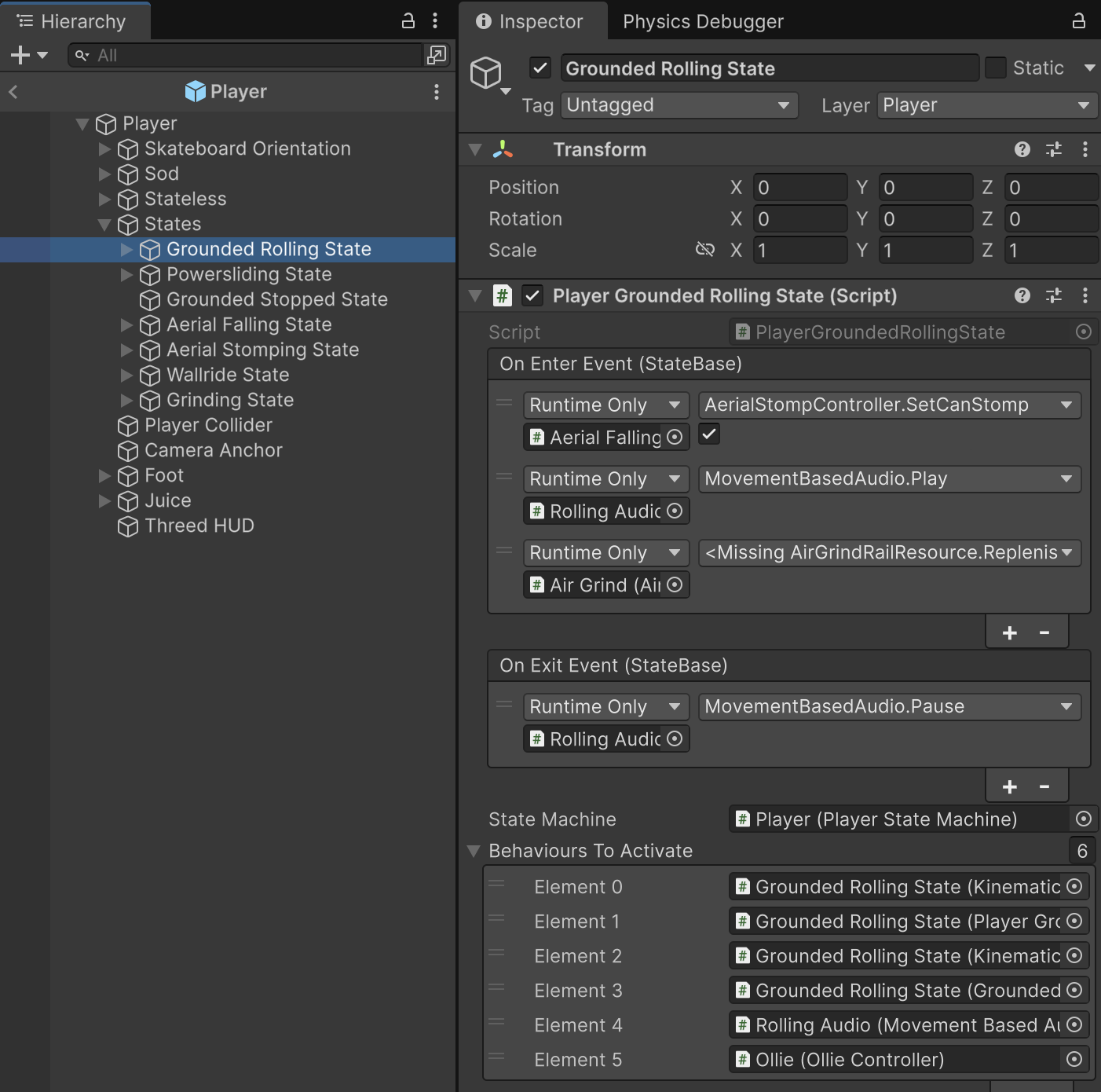 The Player prefab in RAGE SK8, with one of the State objects selected.